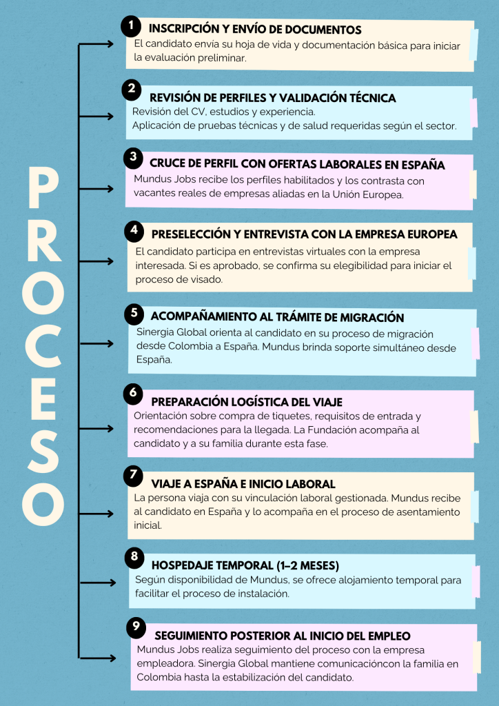Esta alianza nos autoriza a difundir información oficial de Mundus Jobs en Colombia, identificar y preparar candidatos, enviar perfiles previamente verificados y acompañar cada fase del proceso.